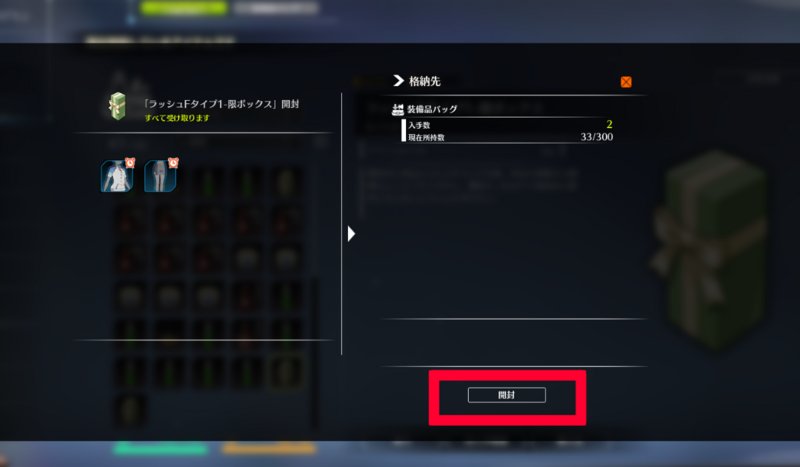 クリアしたら、コマンドメニューを開き、所持品から「ラッシュタイプ1限ボックス」を開封します。女性キャラの場合は「F」がついてるほうを開封しないとイベントリに入らないので注意です。