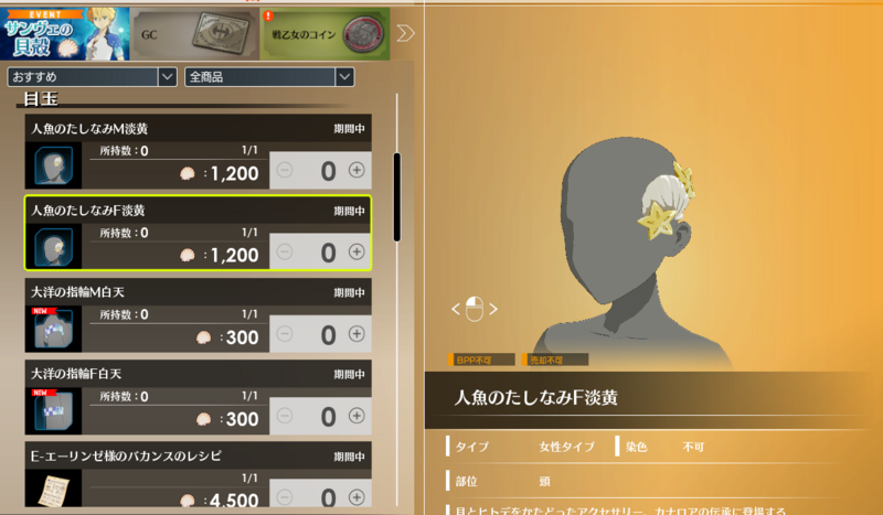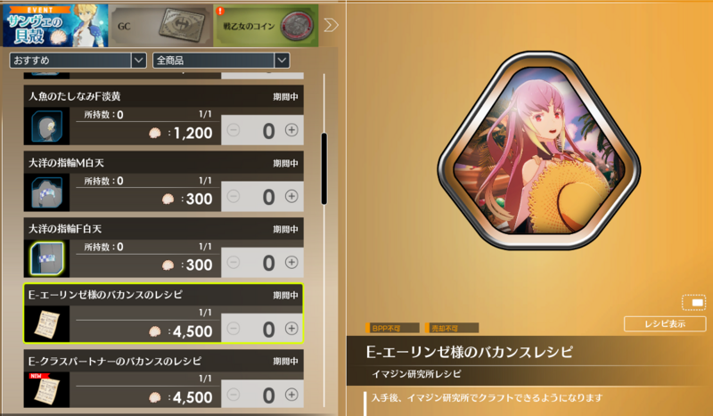 水着衣装、アクセサリー、イマジン、ジェスチャーや消耗品という盛沢山のゲーム内アイテムを「サンヴェの貝殻」と交換できます。