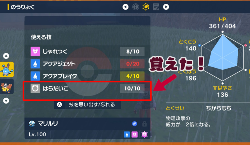 ▼ピクニックを終了して、マリルリがはらだいこを覚えていれば成功です!