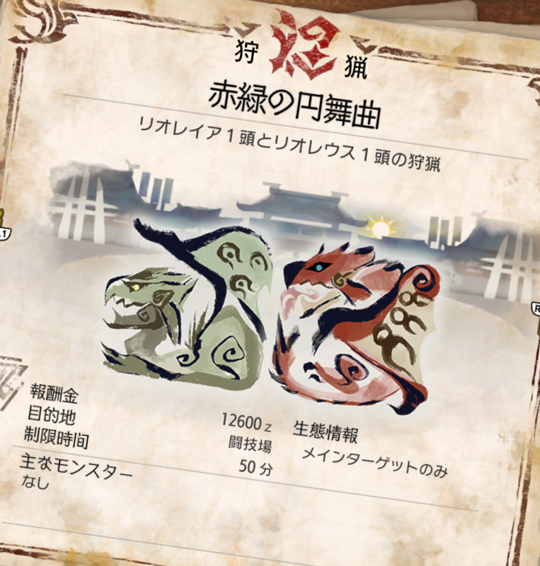 内容としては、闘技場でもレオレイア、リオレウスの狩猟となっています。