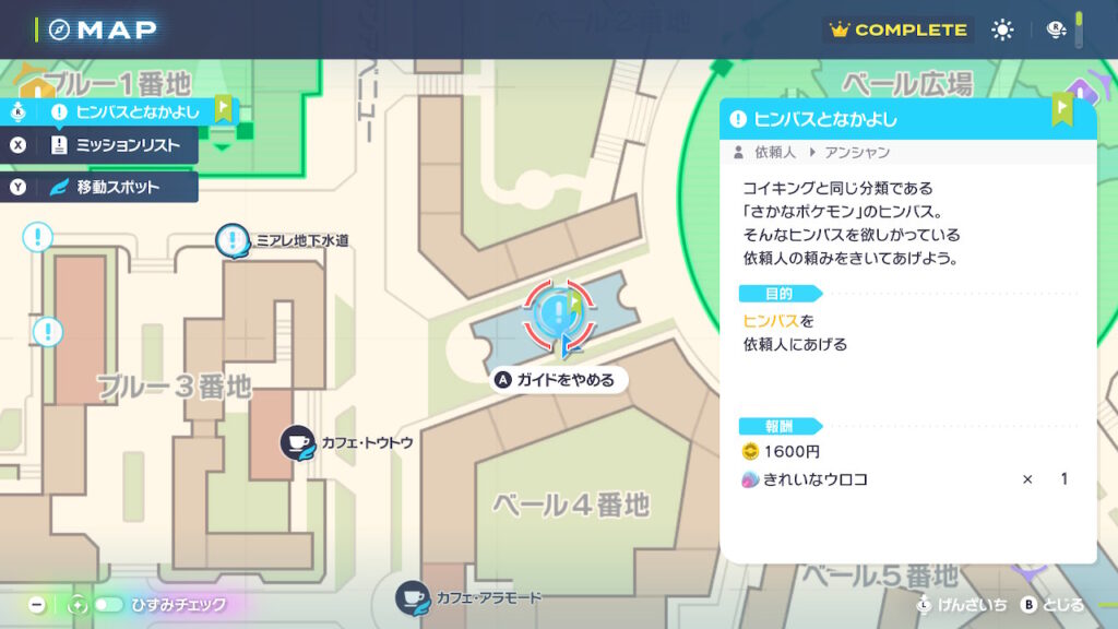 サイドミッション160 ヒンバスとなかよしをクリアすることで、ミアレシティ内でヒンバスを捕まえることができるようになります。