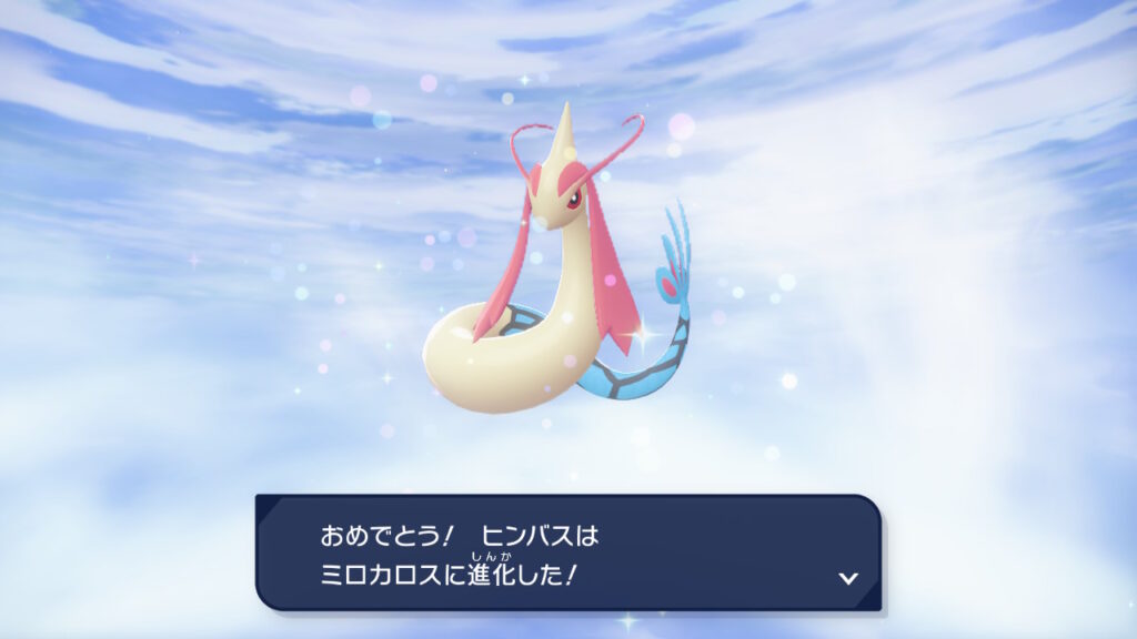きれいなウロコを持たせた、ヒンバスを通信交換することで、ミロカロスへと進化します。