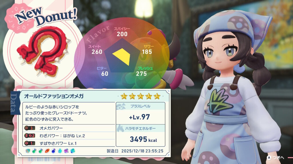 「オールドファッションオメガ」はメガ次元ラッシュにて、グラードンが出現する、異次元ミアレに行くために必要なドーナツです。このドーナツを作るために必要なフレーバーは以下の通りです。