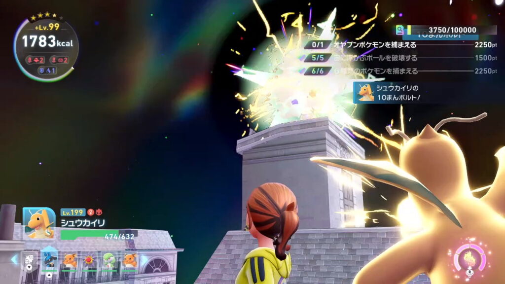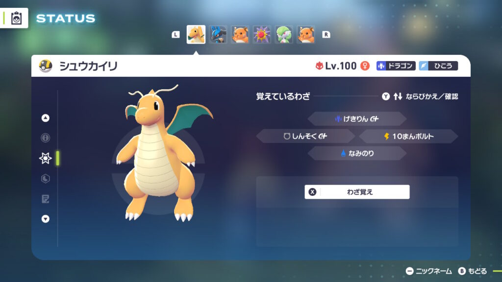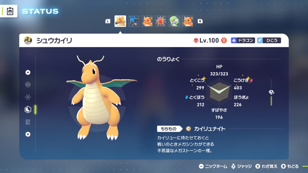 Pokémon Legends ZA メガ次元ラッシュにおいて、クリア後は異次元ミアレを探索するゲームと化したPokémonLegendsZAにて、異次元ミアレ内で出現する、ミッション(タスク)を交代という手間を省きカイリュー1体で全てこなせるように育成したカイリューです。